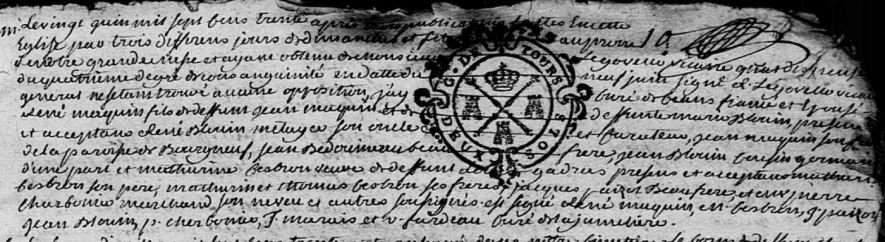 Le vingt juin mil sept cens trente après les publications faictes en cette église par trois différens jours et dimanches et fetes au prones de notre grande messe et ayant obtenu de Monsieur LEGOVELLO vicaire général, dispense du quatrieme degré de consanguinité en datte du neuf juin signé LE GOVELLO vicaire général, ne s’estant trouvé aucune opposition j’ay curé de ceans fiancé et épousé René MAQUIN fils de défunt Jean MAQUIN et de défunte Marie BLOUIN, présent et acceptans René BLOUIN métayer son oncle et curateur, Jean MACQUIN son frère de la paroisse de Bourgneuf, Jean BEDOUIINEAU beau frère, Jean BLOUIN cousin germain d’une part, et Mathurine CESBRON, veuve de défunt Louis GADRAS, présens et acceptant, Mathurin CESBRON son père, Mathurin et Thomas CESBRON ses frères, Jacques PAIZOT beau père, et Me Pierre CHARBONIER marchand son neveu, et autres soussignés, est signé René Maquin, M. Cesbron, J. Paizot, Jean Blouin, P. Cherbonier, J. MArais, et R. Fardeau curé de la Jumelière.