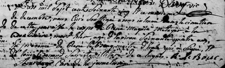 L’an mil sept cent soixante cinq et ce neuviesme jour de decembre, nous curé soussigné avons inhumé dans le cimetiere de cette paroisse le corps de René MAQUIN métayer à La Boutinière, mort hier, agé d’environ soixante quatre ans, en présence de René Le BOURG maitre d’école qui a signé et de Louis BENARD sacriste illeteré de ce enquis.