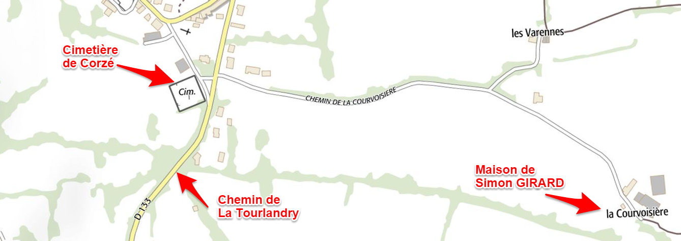 Le cimetière de Cossé, si l’on en croit les cartes actuelles, se trouve être à proximité du chemin qui allait de Cossé à La Tourlandry ainsi que du chemin de La Courvoisière. Simon GIRARD n’était donc pas très loin de chez lui. Revenait-il de La Tourlandry où, selon Célestin Port, se tenait justement, le samedi, un marché ? Se serait-il ainsi fait attaquer sur le chemin du retour par des voleurs qui l’auraient suivi dans le but de lui dérober l’argent qu’il venait peut-être de gagner en y vendant quelque bête ou quelques récoltes ? … Nous ne le saurons bien évidemment jamais…