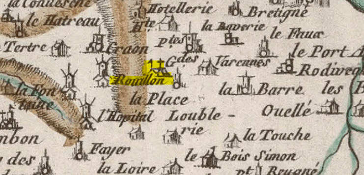 Ferme, commune de Villévêque, – Roillum 1104-1124 (Cartul. du Ronc. Rot. 4, ch. 41). – Royllon 1336 (G. Cures). – Le grand chemin comme l’on va de Rouillon à Villévêque 1472 (Ibid.). – Le lieu, fief et seigneurie de Roullon 1539 (C 105, f. 292 v°). – Ancien fief et seigneurie avec manoir noble, relevant de l’évêque, seigneur baron de Villévêque, « à un baiser de bouche et les mains ». En est sieur Michel de Cherbaie, 1451, Thomas Jamelot, échevin d’Angers, 1474, Noble Homme Anceau Jamelot 1539, Noble Homme François de la Roussardière 1602, 1664, Margurite Cazet, veuve en premières noces de François de la Roussardière, remariée avec Jean-Elisabeth de Reclèves, chevalier, qui vend à Charles de Grimaudet, chevalier, vers 1701 ; Charles-Louis Volaige de Vaugirault 1780, – et encore aujourd’hui à la famille.