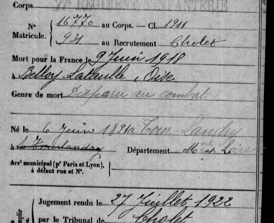 Sa blessure était sans doute légère, ou du moins a-t-elle guéri convenablement, puisqu’on le retrouve l’année suivante, le 9 juin 1918, de nouveau sur le champ de bataille. Hélas, cette fois, c’est pour y rencontrer la mort. Il est en effet porté disparu dans un combat ayant eu lieu près de Lataulle, dans l’Oise. C’était il y a tout juste cent ans ; il venait d’avoir 27 ans.