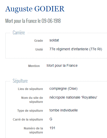 On trouve également sur le site Mémoire des Hommes, une fiche concernant sa sépulture. Auguste GODIER repose à la nécropole nationale de Royallieu, près de Compiègne, dans l’Oise. Sa tombe, individuelle, se trouve dans le carré G et porte le numéro 191.