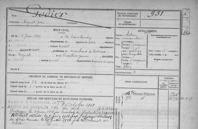 Le 6 juin 1891 naissait à La Tourlandry (49), plus précisément à L’Ambatterie, Auguste Jean GODIER. Il était le fils d’un marchand, Auguste GODIER et d’une marchande, Jeanne CREPELLIERE. Son acte de naissance ne présente aucune mention marginale. Son père savait signer.