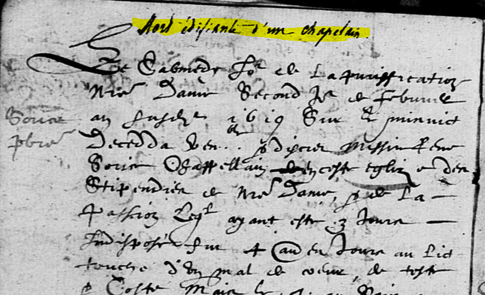 On rencontre également la mort de René LEFEBVRE, le 12 novembre 1614, qui fut maréchal avant d’être ordonné prêtre et surtout celle de René SORICE, dont l’acte ressemble à un véritable hommage car il décrit un homme mort quasiment en odeur de Sainteté ! C’est sans doute la raison pour laquelle, quelqu’un a ajouté, sans doute plus tard, au dessus de son acte de décès, ce titre élogieux : Mort édifiante d’un chapellain.