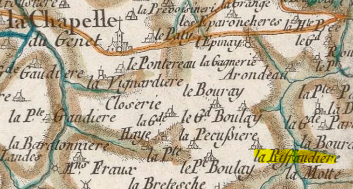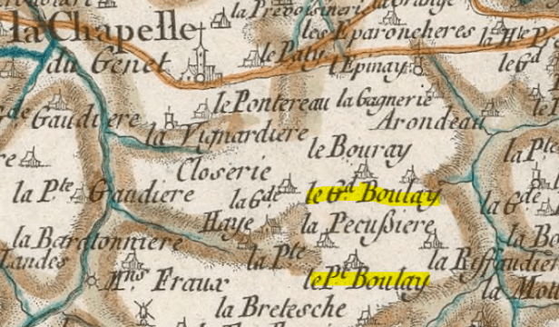 [2] Pour le Bouslay, il semble qu’il y ait eu deux lieux que l’on différenciait par, l’un, le Boulay Aubron, et l’autre, le Boulay Verron. Sur la carte de Cassini, on ne lit que Le Petit et Le Grand Boulay…