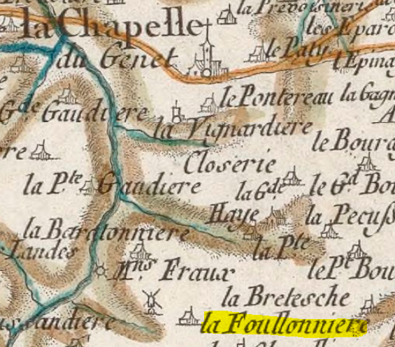 Arondeau (Moulin d’Arondeau) – Bourré – Le Bouslay Aubron (alias Le Petit Boulay) – Le Bouslay Verron – La Bretesche –  La Caffardière – Cestier (Moulin de Cestier) – La Chardonnerie (paroisse Saint Martin) – La Charnière (Métairie de La Charnière) – La Chasserie – Moulin de Chevreau – Les Eparonchères (L’Esparanchère) – Ferault – La Foullonnière – La Gaignerie de l’Espinay (L’Espinay, Le Petit Espinay, La Cour de L’Espinay, La Métaierie de la Gaignerie…) –– La Petite Gaudière – La Grange (La métairie de La Grange) –   La Haie – La Grande Haie –  La Maison Neuve – La Martinière – La Nicquerie – Le Pasty – La Pécussière – La Pelevoisinerie – Le Pont (Le Bordage du Pont) – Le Moulin du Pont – La Riffaudière – La Roullière – La Vignardière.