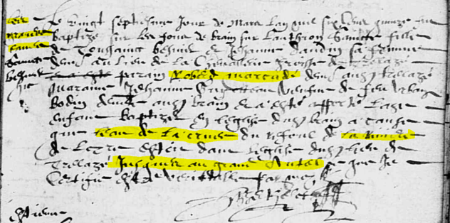 Le vingt septiesme jour de mars l’an mil six cent quinze fut baptizé sur les fons de Brain sur l’Authion Saincte, fille de Toussainct BESNIER et Jehanne DAUDIN sa femme demeurant au lieu de La Chevallerie, paroisse de Trélazé, parain Robert MARCADÉ demeurant audit Trélazé, maraine Jehanne GUYOTTEAU veufve de feu Urban BODIN demeurant audit Brain et a esté  apporté ladite enfant baptizer en l’église dudit Brain à cause que l’eau de la crue du reflue (?)  de la rivière de Loyre estoit dans l’éflise dudit lieu de Trelazé jusques au grand Autel ce que je certifie estre véritable par moy Berthelot.