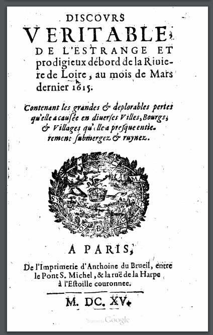 Discours véritable de l’estrange et prodigieux débord de la Riviere de Loire au mois de mars dernier 1615. (GoogleBooks)