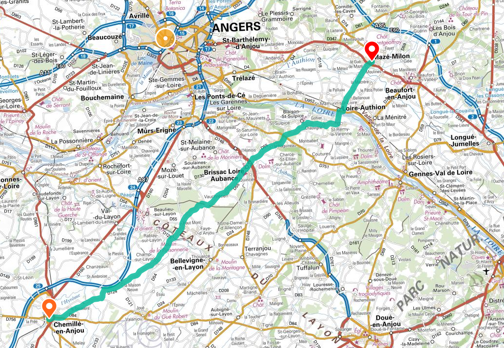 Trajet (à pied) de Mazé à Chemillé – (Geoportail)