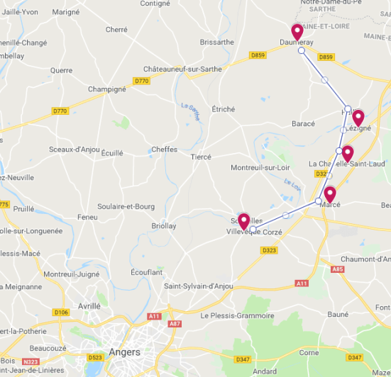 Daumeray se situe à une trentaine de kilomètres au nord d’Angers. Un certain nombre de mes ancêtres en sont originaires. Les descendants de Mathurin MORIN et Antoinette FLEURI se sont peu à peu déplacés à Lézigné, puis à La Chapelle-Saint-Laud, à Marcé et enfin à Villevêque.