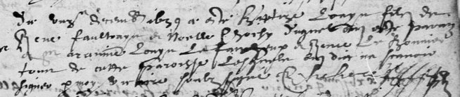 Le unziesme decembre 1639 a esté baptizé Louys dils de René FAULTRAYS et Noelle CHOISY duquel ont esté parain et marainne Louiys LEFAUCHEUX et Renée LE BONNIER, tous de cette paroisse, lesquels ont dit ne scavoir signer.