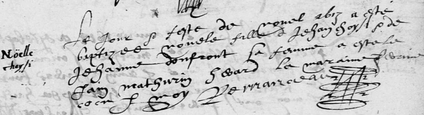 Le jour et feste de Nouel 1613 a esté baptizée Nouele fille de Jehan CHOYSI et de Jehanne DONFRONT sa femme, a esté le parain Mathurin HERARD, la marainne Perrine COCU, par moy Lemanceau.