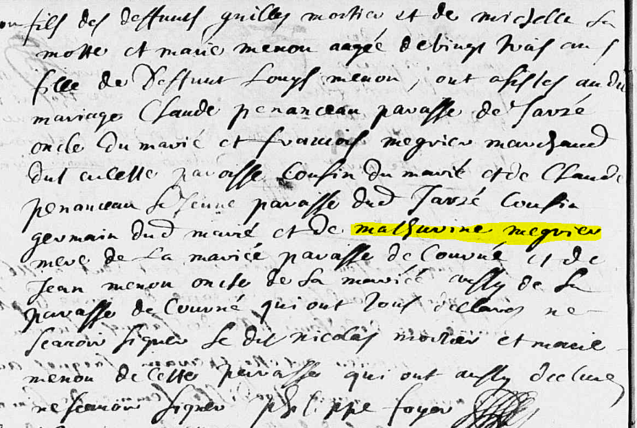 Mais c’était il y a dix ans, et depuis, j’ai, heureusement, fait quelques progrès en paléographie. Et puisque cette méprise aussitôt corrigée, m’offre, grâce à Geneanet, une petite floppée d’ancêtres supplémentaires, restons quand même quelque temps avec Mathurine MEGRIER ou MAIGRIER…