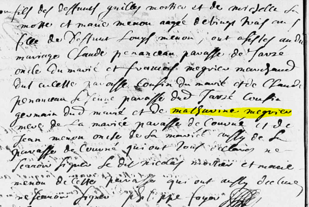 Bon ! Ma belle négrière n’a pas fait long feu ! En réalité, il s’agit d’une MEGRIER comme le montre bien cet acte de mariage sur lequel elle apparaît.