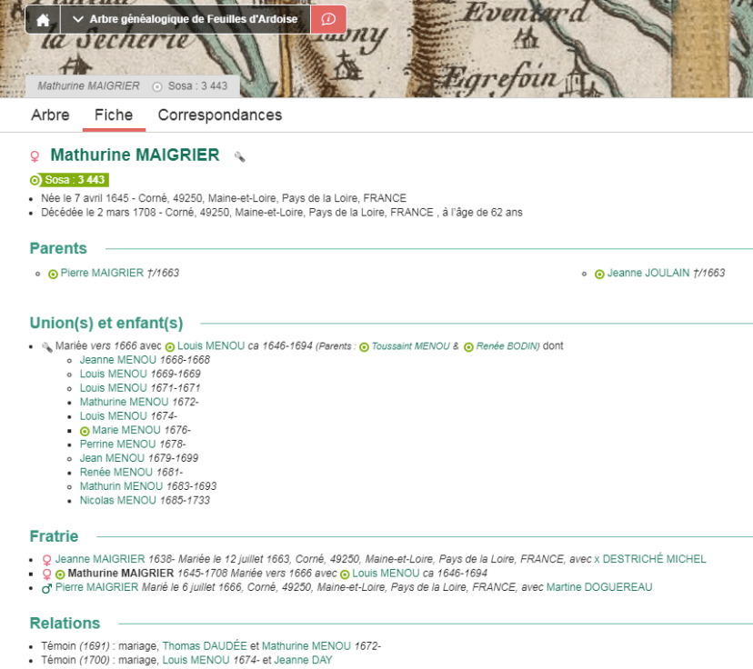• Mathurine (1672), mariée à Thomas DAUDÉEle premier décembre 1691, à Corné. Ses parents sont encore en vie.