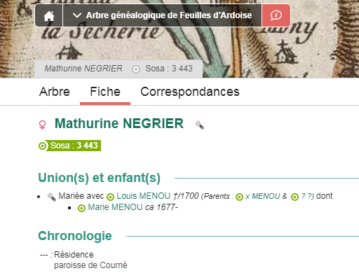 • Marie (1676), dont je descends, mariée le 1er juillet 1700, à Bauné, avec Nicolas MORTIER.
