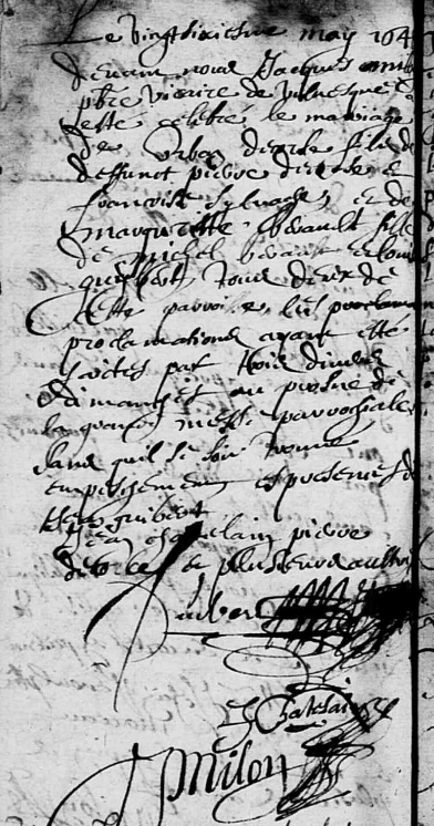 Le vingt sixiesme may 1648 devant nous Jacques MILON prestre vicaire de Villevesque a esté célébré le mariage de Urban DECORCE fils de deffunct Pierre DECORCE et de Françoise SYLVACHE, et de Marguerite BERAULT fille de Michel BERAULT et Louise GUYBERT tous deux de cette paroisse, les proclamations ayant esté faictes par trois derniers dimanches au prosne de la Grande Messe Parroissiale, sans qu’il se soit trouvé empeschement, en présence de Jehan GUIBERT, Jean CHASTELAIN, Pierre DECORCE et plulsieurs aultres.