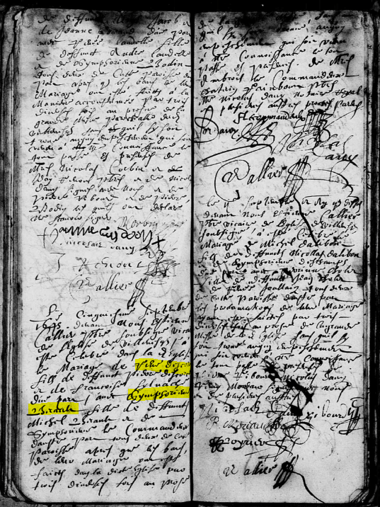Le cinquiesme septembre 1645 devant nous Estienne CALLIER prestre soubsigné vicaire en l’église de Villevesque a esté celebré dans la dite église le mariage de René DESCORCE fils de deffunct Pierre DESCORCE et de Françoise SYLVACHE d’une part, avec Symphorienne BERAULT fille de deffunct Michel BERAULT et de Symphorienne LE COMMANDEUX d’autre part, tous deux de cette paroisse, après que les bans de leur mariage ont estés faicts dans la dite église par trois diverses fois au prosne de la grande messe, sans qu’il s’y soit trouvé aucun empeschement qui soit venu à nostre connoissance, le tout passé es presence de Mrs Ambrois LE COMMANDEUX, Caterin RAINBOUR prestre, Me Nicolas DAVY notaire royal et plusieurs autres proches parens.