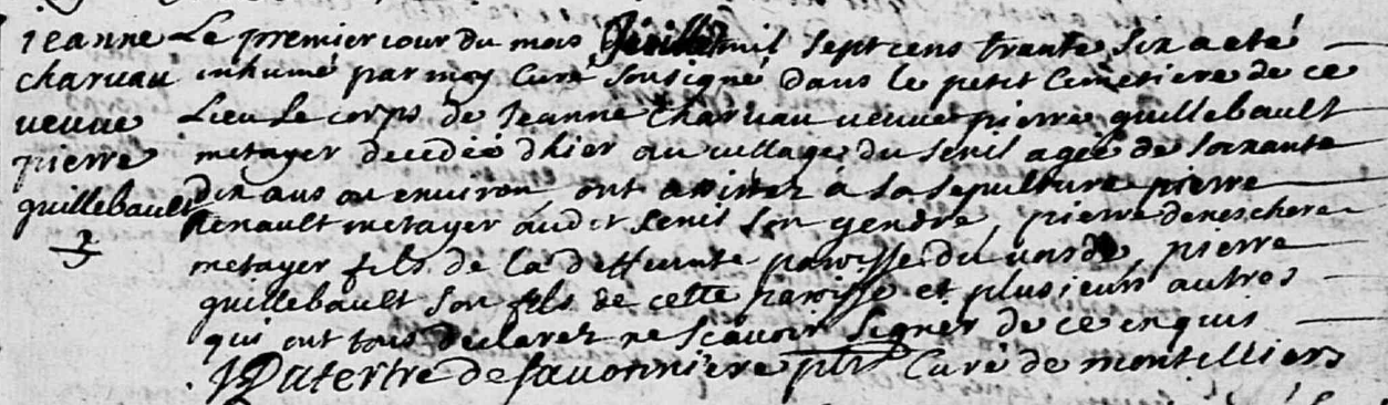Le premier jour du mois de juillet mil sept cens trente six a esté inhumé par moy curé sousigné dans le petit cimetiere de ce lieu le corps de Jeanne CHARUAU veuve Pierre GUIBAULT metayer decedée d’hier au village du Senil agée de soixante dix ans ou environ ont assistez à la sépulture Pierre RENAULT metayer audit Senil son gendre, Pierre DENESCHERE metayer fils de la deffunte paroisse du Voisde, Pierre GUILLEBAULT son fils de cette paroisse et plusieurs aultres qui ont tous declarés ne scavoir signer de ce enquis.