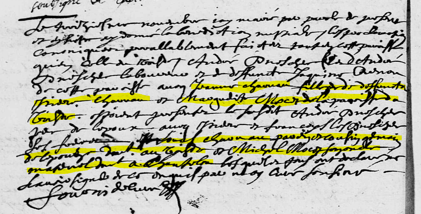 Le troisiesme novembre j’ay marié par parole de present et… ay donné la bénédiction nuptiale, les proclamations canoniques preallablement faites tant en cette paroisse qu’en celle du Voide, André DENESCHERE fils d’André DENESCHERE laboureur et de deffuncte Jacquine RENOU de cette paroisse avec Jeanne CHARUAU fille de deffunct Pierre CHARUAU et Marguerite MOCET de la paroisse du Voisde, estoient presentz le susdit André DENESCHERE père de l’époux avecq Pierre et François les DENESCHERES ses frères, et Louis CHARUAU parrain et cousin germain de l’espouse demeurant au Voisde et Michel MOCET son oncle maternel demeurant à Chantelou, lesquels tous ont declaré ne savoir signer de ce enquis par moy curé sousigné.