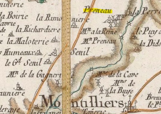 Jeanne CHARUAU eut avec André DENECHERE cinq enfants. Le couple demeurait alors au Petit Seneil (Carte Cassini, Senil), puis au Préneau à Montillers. En 1689 naissait Perrine, puis André en 1691. Les deux enfants meurent cependant l’année suivante, en 1692, l’un en mars, l’autre en juin. Pierre, dont je descends, naquit l’année suivante en 1693, suivi en 1695 d’André, deuxième du nom, qui ne vivra qu’un mois seulement, et enfin une fille, Renée en 1696. Hélas ! En 1697, André DENECHERE meurt et Jeanne CHARUAU se retrouve donc veuve avec deux petits enfants en bas-âge.