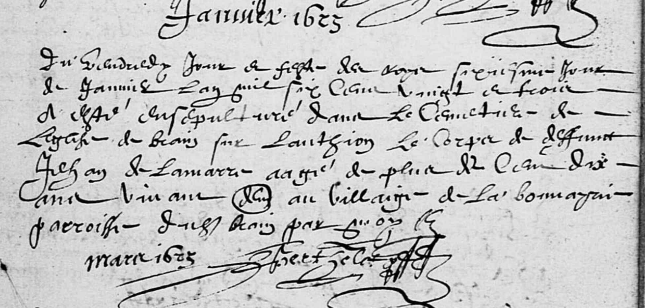 Le vendredy jour et feste des Roys, sixiesme jour de janvier, l’an mil six cent vingt et trois, a esté ensepulturé dans le cimetiere de l’église de Brain sur l’Authion, le corps de deffunct Jehan DE LA MARRE, aagé de plus de cent dix ans, vivant demeurant au villaige de La Bonnayrie, parroisse dudit Brain par moy.