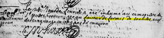 Le 24 ème jour de feuvrier a esté inhumé au cimetiere de Sr Pierre, Guillaume PEAN, faiseur de formes de souliers, aagé de cinquante et cinq ans ou environ.