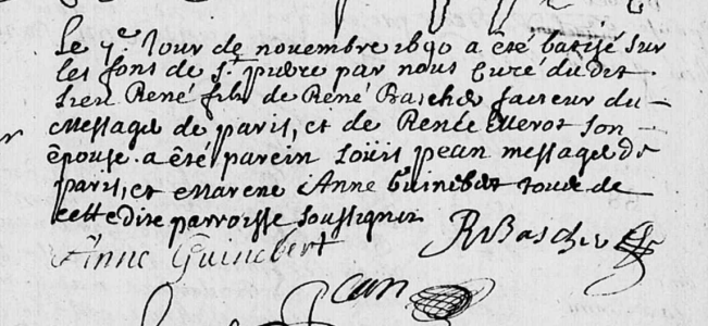 Le 7è jour de novembre 1690 a été batisé sur les fons de Saint Pierre par nous curé du dit lieu René fils de René BASCHER facteur du messager de Paris, et de Renée MEROT son épouse, a été parein Louis PEAN messager de Paris et marene Anne GUINEBERT tous de cette dite parroisse soussignés.