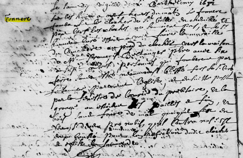 Le samedy vigille de Saint Barthélémy 1681 sur les huit à neuf heures du matin, le tonnere tomba sur le clocher de Saint Gilles en Chemillé et pour lors les cloches ne sonnoient pas, et le sieur HUMEAU, curé, estoit à voir faire la muraille du cimetiere au pied du clocher vers la maison de Messire François BELLANGER, prestre, avec six ou sept autres personnes qui tomberent par terre sans estre neanmoins blessé fors le sieur curé. Le tonnerre parcourut l’église, et ensuite passa par la fenestre de l’écurie du presbitaire et la grange ou estoient les paillis et fois, et bois, sans faire de mal quoiqu’il fust en feu. Si Deus pro nobis, quis contra nos. Il en a cousté pour la refection dudit clocher