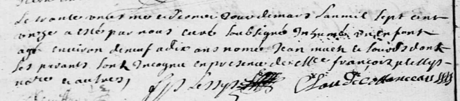 Le trante uniesme et dernier jour de mars l’an mil sept cent unze a esté par nous curé soubsigné inhumé un enfant agé d’environ de neuf à dix ans, nomé Jean, muet et sourd, dont les parants sont incognu, en presence de Maistre François PLESSYS notaire et autres.