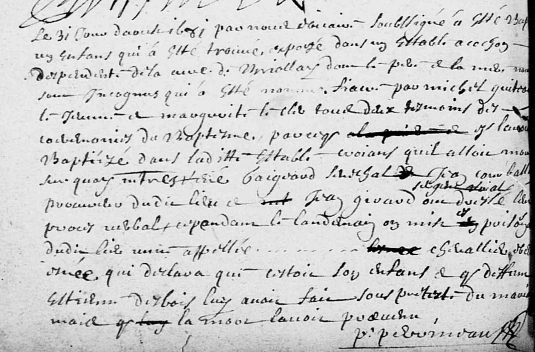 Le 31 jour d’aoust 1681 par nous vicaire soubssigné a esté baptisé un enfant qui a esté trouvé dans une estable à cochon, despendant de la cure de Briollay dont le pere et la mère nous sont incognus qui a esté nommé Fiacre, par Michel GUITON le Jeune et Marguerite LE CLER tous deux tesmoins des ceremonies du bapteme, parce qu’ils l’avoient baptisé dans ladite estable, croiant qu’il alloit mourir, sur quoy maîtres René GAIGEARD seneschal, Jean COURBALLAY procureur dudit lieu et Jean GIRARD sergent roial ont dressé leur proces verbal, cependant le landemain on mist es prison dudit lieu, aucune appelée [blanc] CHEVALLIER mère [un mot ?] qui declara que c’estoit son enfant et que deffunt Estienne DESBOIS luy avoit fait sous pretexte du mariage mais que la mort l’avoit prévenu.