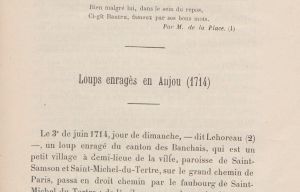 - Ravages causés en Anjou par les loups enragés. (Soland, Aimé de, Bulletin historique et monumental de l’Anjou, Angers, 1855, Troisième Année, n°11, p. 168-169.)