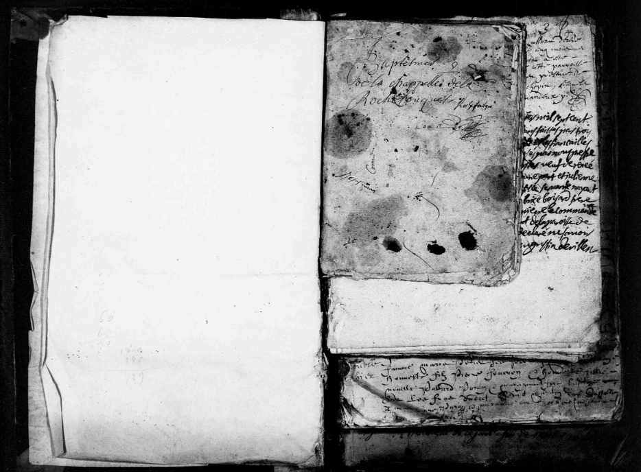BAUDUCEAU Jeanne – 1649.12.09 – « Le 9è [fevrier barré] décembre a esté baptisé Jeanne fille de Jean BODUSSEAU et de Jeanne BELANGER, parrain Jean Le MONIER, marraine Jeanne ALAINNE » [Attention – Acte écrit sur bout de papier sans année précisée]