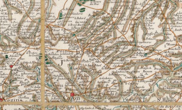 - 30 octobre 1633. Baptême de Perrine CAILLAUD, dont le père est décédé. Sa mère et sa marraine sont qualifiées de pauvres et passagères. Elles seraient originaires de la paroisse de Chanbronne ou Chaubronne. Je n’ai pas identifié cette paroisse mais il se pourrait bien qu’il s’agisse de Saint-Pierre-des-Échaubrognes, situé actuellement dans les Deux-Sèvres, à environ 25 kilomètres au sud de Melay.