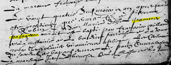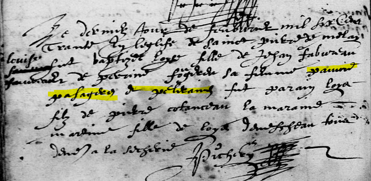 - 28 février 1630 – Baptême de Louise Fabvreau, fille de Jehan FABVREAU et de Perrine FOUGEREAU sa femme, pauvres passagers et pèlerins, d’origine inconnue.
