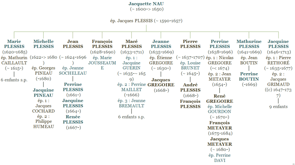 C’est très étonnant car de nombreux enfants mouraient en bas-âge et peu de familles échappaient à cette triste fatalité ; pourtant tous les enfants de Jacques PLESSIS et de Jacquette NAU se sont mariés et ont eu une descendance.  Leurs mariages s’échelonnent de 1642 (Marie, fille aînée) à 1678 (Jacquine, petite dernière), et les décès de 1669 (Jeanne et Mathurine) à 1713 (Jacquine).