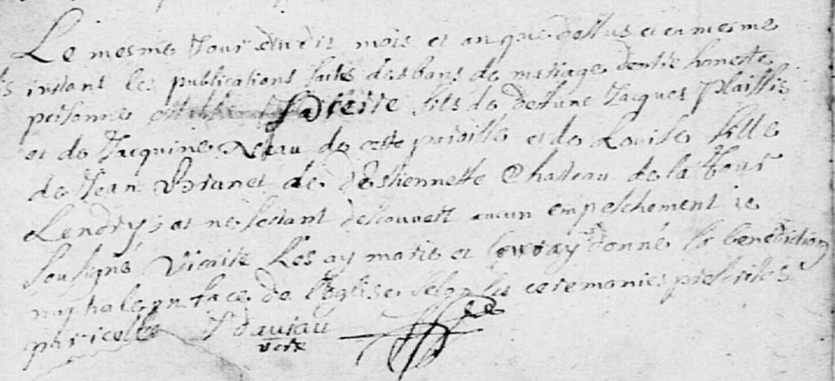 Dans ce dernier acte, le prêtre s’est même trompé : il avait écrit Macé, qu’il a effacé, à la place de Pierre, qu’il a réécrit sur le nom PLAISSIS. Il ne semble pas y avoir de « s » à défunt, aussi Jacquette NAU est-elle peut-être encore en vie… Je cherche toujours son acte de décès…