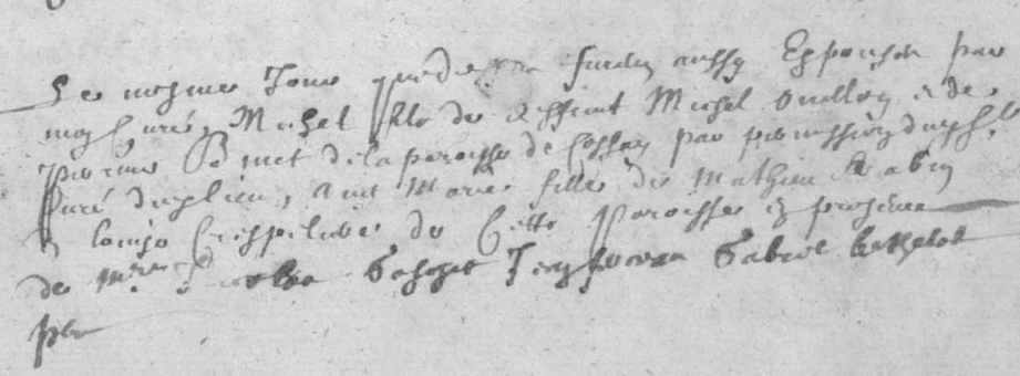 Le mesme jour que dessus furent aussy espouses par moys curé Michel fils de deffunct Michel ONILLON et de Perrine BINET de la paroisse de Cossay par permission dudit curé dudit lieu, avec Marie fille de Mathieu RABIN et Louise CRESPELIERE de cette paroisse en presence de Messires Nicolas GASCHET, Jean FEREAU, Gabriel BERTHELOT prestres.