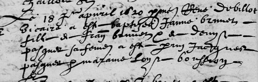 Le 18 jour d’apvril 1620 par moy René DEBILLOT vicaire a esté baptizée Janne BRUNET fille de François BRUNET et de Denyse PASQUIER sa femme, a esté parrain Jacques PASQUIER et maraine Louise BOUSSION.