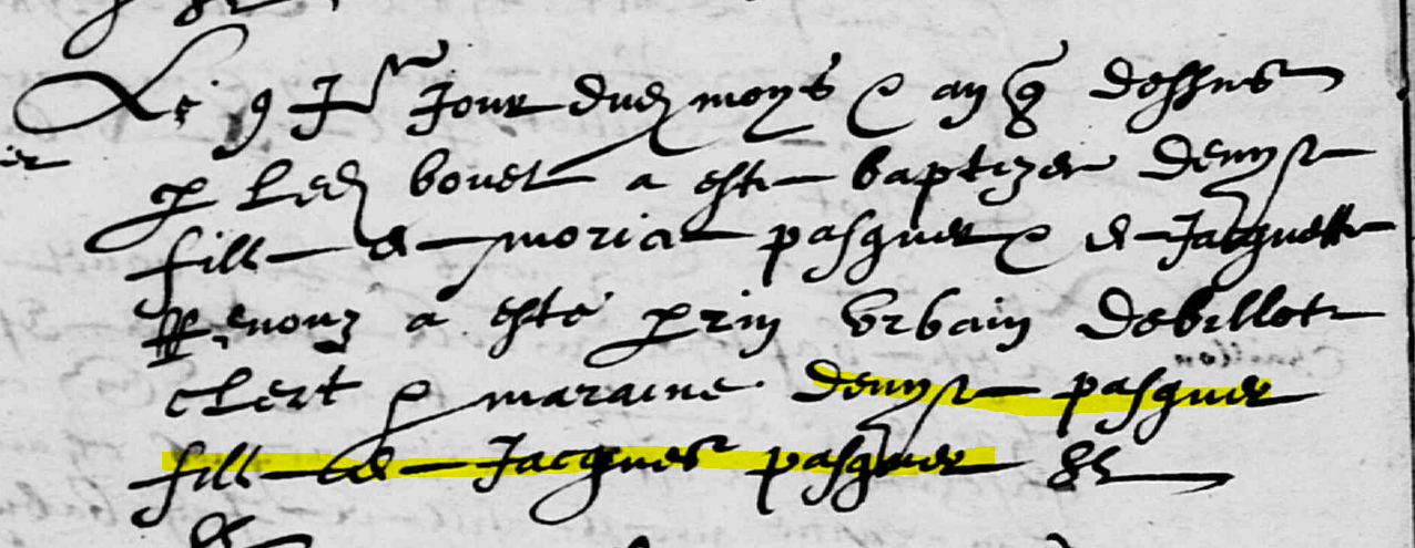 En 1612, Denise PASQUIER est la marraine de … Denise PASQUIER, fille de Maurice PASQUIER et de Jacquette RENOU et à cette occasion le curé nous gratifie de la mention suivante : « marraine Denise PASQUIER fille de Jacques PASQUIER » ; or, en raison de la rareté du prénom Denise, on peut être quasi assuré qu’il s’agit bien d’elle. (Et j’ai cherché, je n’ai trouvé aucune autre Denise…!)
