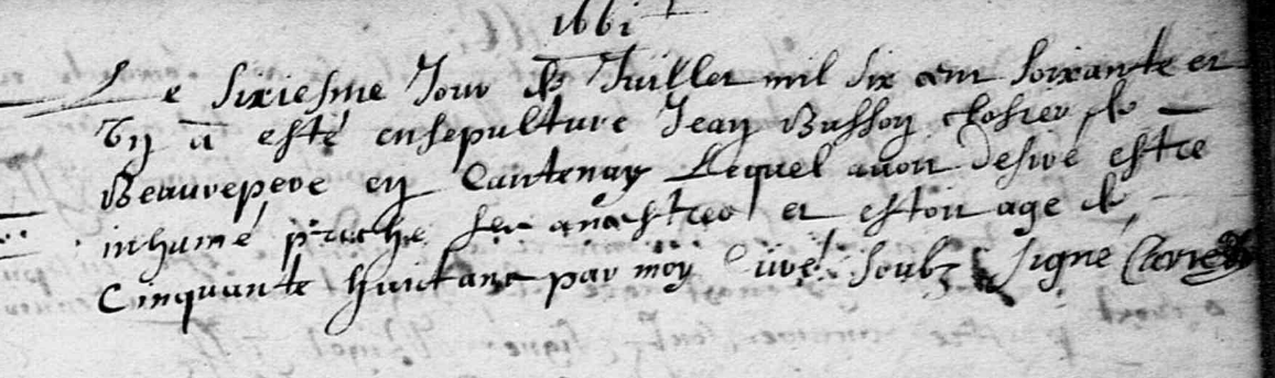 Le sixiesme jour de juillet mil six cent soixante et un a esté ensepulturé Jean BUSSON closier de Beaurepere en Cantenay, lequel avoit désiré estre inhumé proche ses maistres et estoit agé de cinquante huict ans, par moy curé soubz signé.