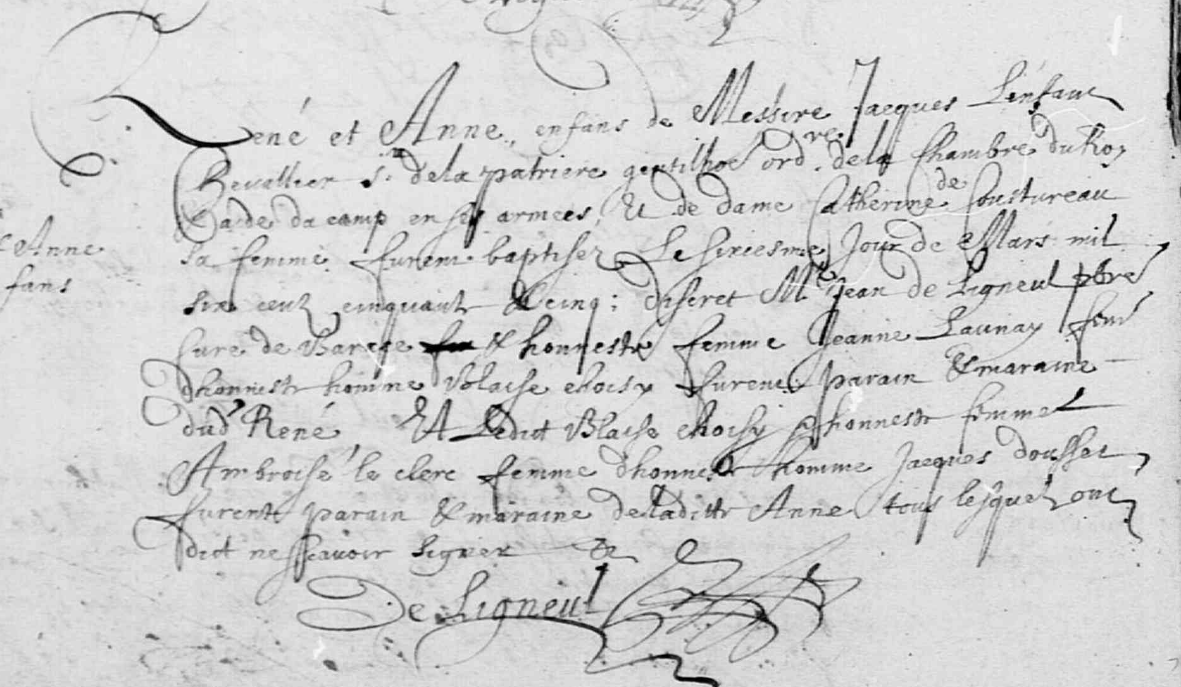René et Anne, enfans de Messire Jacques LENFANT chevallier Sieur de la Patrière, Gentilhomme ordinaire de la Chambre du Roy et aide de camp en ses armées, et de dame Catherine de COUSTUREAU sa femme, furent baptisez le sixiesme jour de mars mil six cent cinquante et cinq ; discret Me Jean de LIGNEUL prestre curé de Baracé et honneste femme Jeanne LAUNAY femme d’honneste homme Blaise CHOISY, furent parrain et maraine de René et ledit Blaise CHOISY et honneste femme Ambroise LE CLERC femme d’honneste homme Jacques DOUSSET, furent parain et maraine de laditte Anne, tous lesquels ont dict ne scavoir signer. De Ligneul.