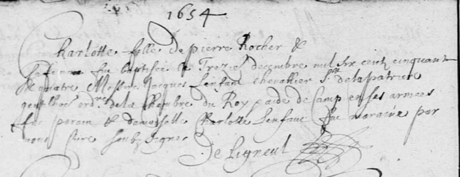 Charlotte fille de Pierre ROCHER et [blanc] sa femme fut baptisée le trezieme decembre mil six cent cinquante et quatre, Messire Jacques LENFANT chevallier Sieur de La Patrière et gentilhomme ordinaire de la Chambre du Roy et aide de camp en ses armées fut parain et damoiselle Charlotte LENFANTfut maraine par nous curé soubzsigné. De Ligneul.