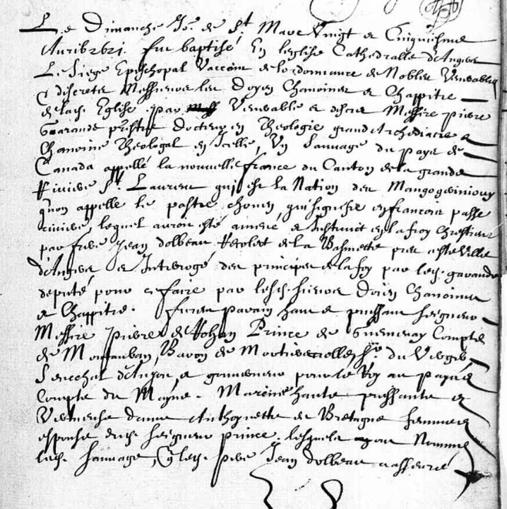 Le dimanche jour de Saint Marc, vingt et cinquiesme avril 1621, fut baptisé en l’église cathédrale d’Angers le siège Epischopal vaccant de l’ordonnance de Nobles, Vénérables et discrets Messieurs les Doyen, Chanoines et Chappitre de ladite Eglise par Vénérable et discret Messire Pierre GUARANDE, prestre docteur en théologie, grand Archidiacre et chanoine Theologal en icelle, un sauvage du pays de Canada appellé la Nouvelle France, du Canton de la Grande Rivière Saint Laurent qui est la nation des Mangogeriniouy qu’on appelle le Pastre Chouen, qui signifie en françois « Passe Rivière », lequel auroit esté amené et instruict en la foy chrestienne par frère Jean DOLBEAU, récolet de La Basmette, près ceste ville d’Angers et interrogé des principes de la foy par ledit GARANDE, deputé pour ce faire par les susdits sieurs doien, chanoines et chapitre ; furent parain haut et puissant Seigneur Messire Pierre de ROHAN, Prince de Guemenay, comptes de Montauban, Baron de Morticrolles, sieur du Verger, Senechal d’Angers et gouverneur pour le Roy au pays et compté du Mayne, marenne haute et puissante et vertueuse dame Anthoynette de Bretagne, femme et espouse dudit seigneur prince, lesquels ont nommé ledit sauvage, comme ledit père Jean DOLBEAU a asseuré
