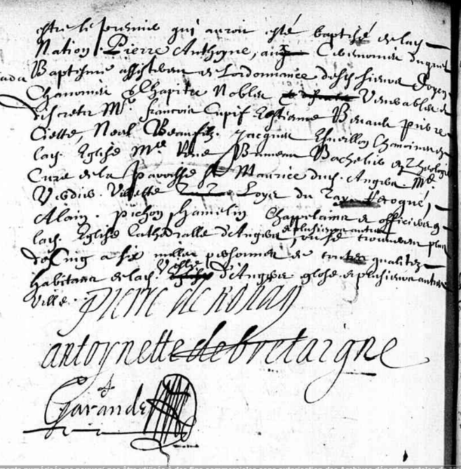 estre le premier qui auroit esté baptisé en ladite nation, Pierre Anthoyne, aux ceremonies duquel baptesme assisterent en l’ordonnace desdits sieurs doyen, chanoines et chapitre, Nobles vénérables et discrets Messires François CUPIF, Estienne BERAULT, Pierre CIETTE, Noel BEAUFILS, Jacques ESVEILLON, chanoines en ladite église, Messire René BRUNEAU bachelier en théologie, curé de la paroisse Saint Maurice dudit Angers, Messires VERDIER, VILETTE, Louys du RAY, RECOGNÉ, Alain PICHON, HAMELIN chappelains et officiers en ladite église cathedralle d’Angers et plusieurs autres, ou se trouverent plus de cinq à six milles personnes de toutes qualitez, habitans en ladite ville d’Angers.