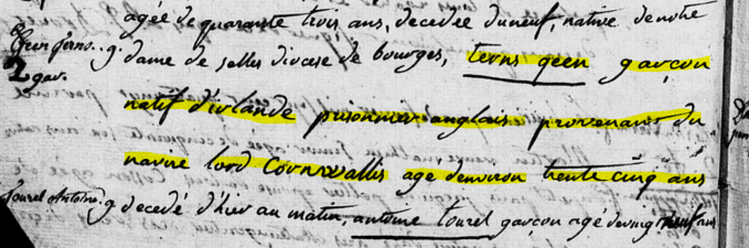 Terns GEEN, garçon natif d’Irlande, prisonnier anglais provenant du navire Lord Cornwalis, âgé d’environ trente cinq ans décédé d’hier au matin, le 11 février 1780.
