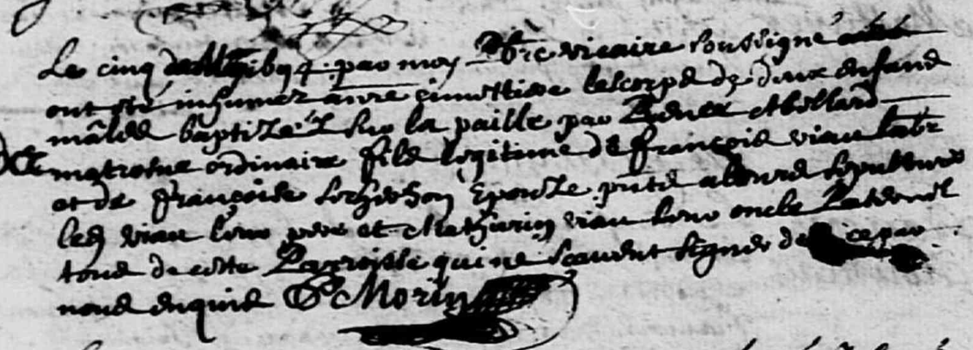 Le cinq de may 1694 par moy prestre vicaire soussigné ont esté inhumez au cimettiere les corps de deux enfants mâles baptizés sur la paille par Renée ABELLARD matrosne ordinaire, fils légitime de François VIAU laboureur et de Françoise LOCHER son espouse, présents a leurs sépultures ledit VIAU leur père et Mathurin VIAU leur oncle paternel tous de cette paroisse qui ne scavent signer de ce par nous enquis.