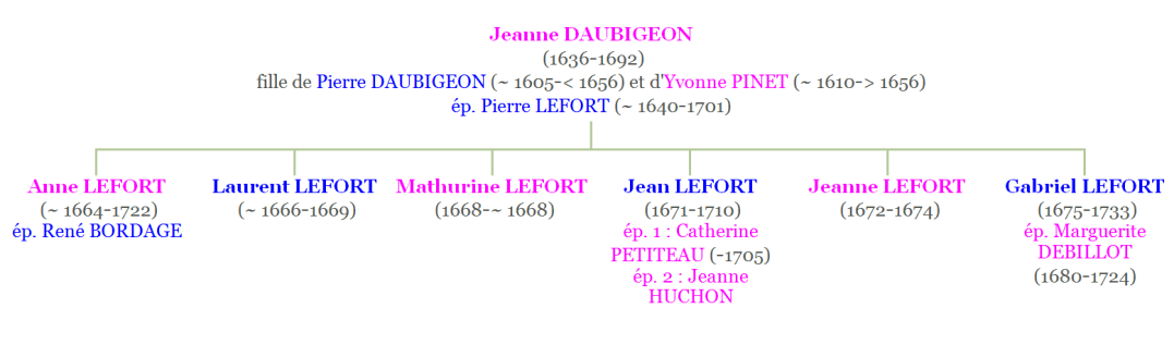 J’ai lu et relu les actes de mariage des enfants de Sébastien DAUBIGEON. Celui de Renée DAUBIGEON avec Pierre BORDERON en particulier,, le 3 mars 1685 à Saint-Lézin, est sans équivoque. Jeanne DAUBIGEON n’est pas la fille de Sébastien DAUBIGEON, elle est sa soeur. Il me faut admettre, un peu à contre-coeur, que ce maître tailleur d’habits n’est pas mon ancêtre direct, mais un collatétal, le frère de ma Jeanne DAUBIGEON.