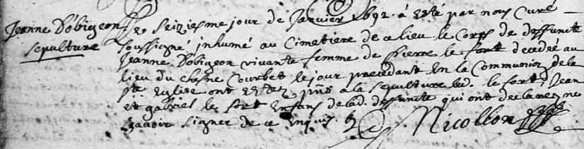 Le 16è jour de janvier 1692 a esté par nous curé soussigné inhumé au cimetiere de ce lieu le corps de deffunte Janne DOBIGEON vivante femme de Pierre LEFORT decedée au lieu du Chesne Courbet le jour precedent en la communion de la Sainte Eglise, ont esté présents à la sépulture ledit LEFORT, Jan et Gabriel LEFORT enfants de ladite deffunte qui ont declaré ne scavoir signer de ce enquis.