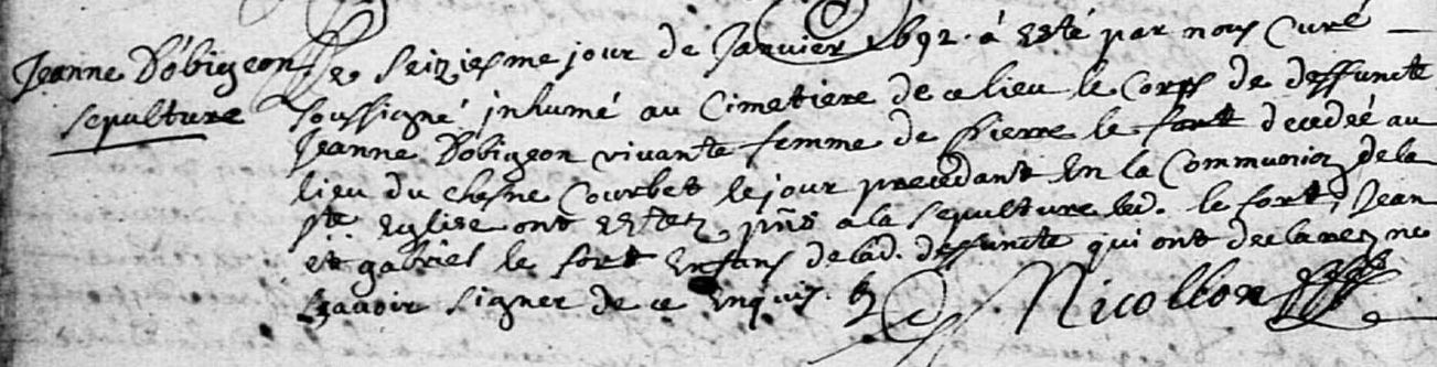 Le 16è jour de janvier 1692 a esté par nous curé soussigné inhumé au cimetiere de ce lieu le corps de deffunte Janne DOBIGEON vivante femme de Pierre LEFORT decedée au lieu du Chesne Courbet le jour precedent en la communion de la Sainte Eglise, ont esté présents à la sépulture ledit LEFORT, Jan et Gabriel LEFORT enfants de ladite deffunte qui ont declaré ne scavoir signer de ce enquis.